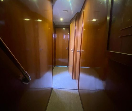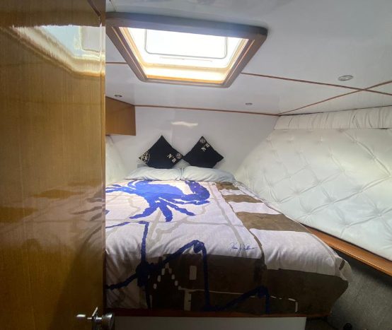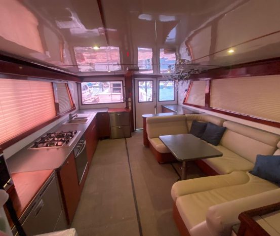 The 2005 Hatteras 54 Convertible is designed specifically to deliver a smooth ride and excellent handling while operating at high speed. The convexity in the hull bottom helps make this hull immensely strong. The slight outward curvature (viewed from keel to chine) reduces impact accelerations and contributes to an incredibly smooth head-sea ride. The 54 is designed for serious sportfishing. The cockpit boasts a bait and tackle center with sink, cutting board and tackle drawers; a bait freezer; storage console with drawers, four rod holders; a removable, full-size in-deck fish box with macerator and an amply proportioned transom door.
