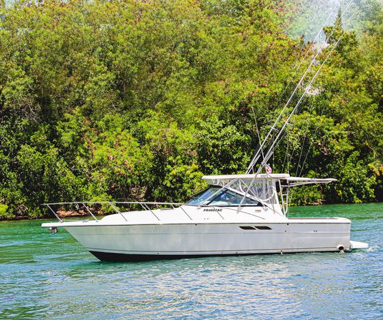 Entire cockpit/helm area is protected with an aluminum and tempered glass windshield and an aluminum radar arch with canvas bimini topand isinglass enclosure. There are decks on the port and starboard side leading forward for fishing, anchoring, and overall accessibility to the front of the boat with (3) cabin top hatch providing light and air to the cabin below.